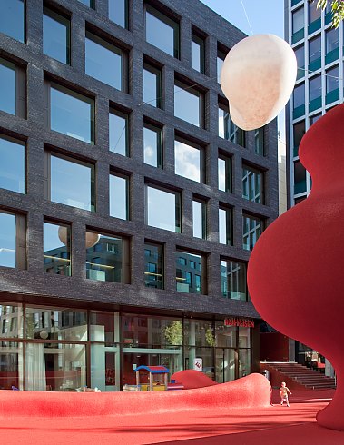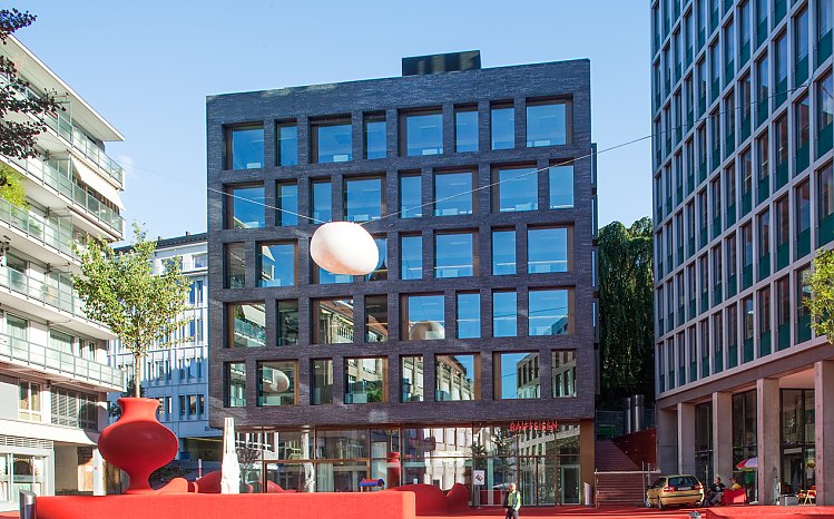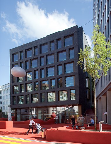 Das repräsentative Bauwerk beherbergt auf fünf Geschossen 110 Büroarbeitsplätze und zahlreiche Nutzungen für die Mitarbeiter. Die Dachterrasse lockt mit einem wunderbaren Blick über die St. Gallener Altstadt. Und dass die Raiffeisenbank ein kinder- und familienfreundliches Unternehmen ist, wird spätestens klar, wenn man vor der zweigeschossigen Kinderkrippe im Erdgeschoss steht, in der nicht nur Kinder von Mitarbeitern willkommen sind. Der rote Teppich der „Stadtlounge“ im Bleicheli-Quartier fließt bis an das Gebäude heran und teilt mit seinen „Falten“ den Außenbereich der hauseigenen Krippe vom öffentlichen Raum ab.
