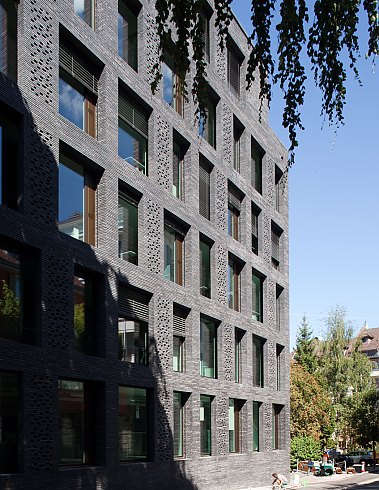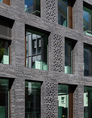 Weitere Assoziationen an die Textilindustrie wecken die gemauerten Lochmuster an einigen vertikalen Fassadenpfeilern. Sie wirken tagsüber als Sonnenschutz mit lockeren Durchblicken und erzeugen interessante Lichteffekte, wenn nach Einbruch der Dunkelheit in den erleuchteten Büros gearbeitet wird.