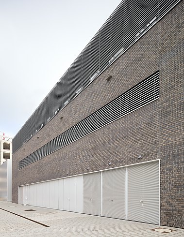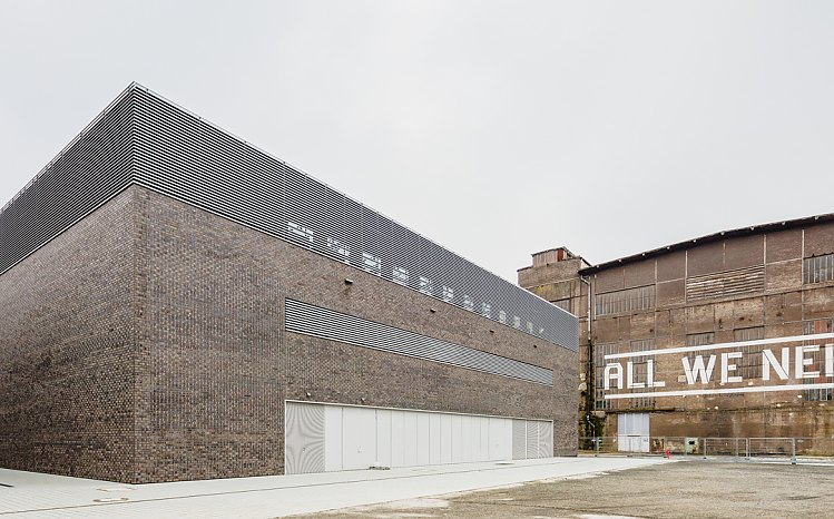 Die Ziegelfassade aus grob strukturierten schwarzbraunen Backsteinen verleiht der Halle einen rauen, lebendigen Charakter, der hervorragend mit den noch vorhandenen Teilen der historischen Industriearchitektur korrespondiert.