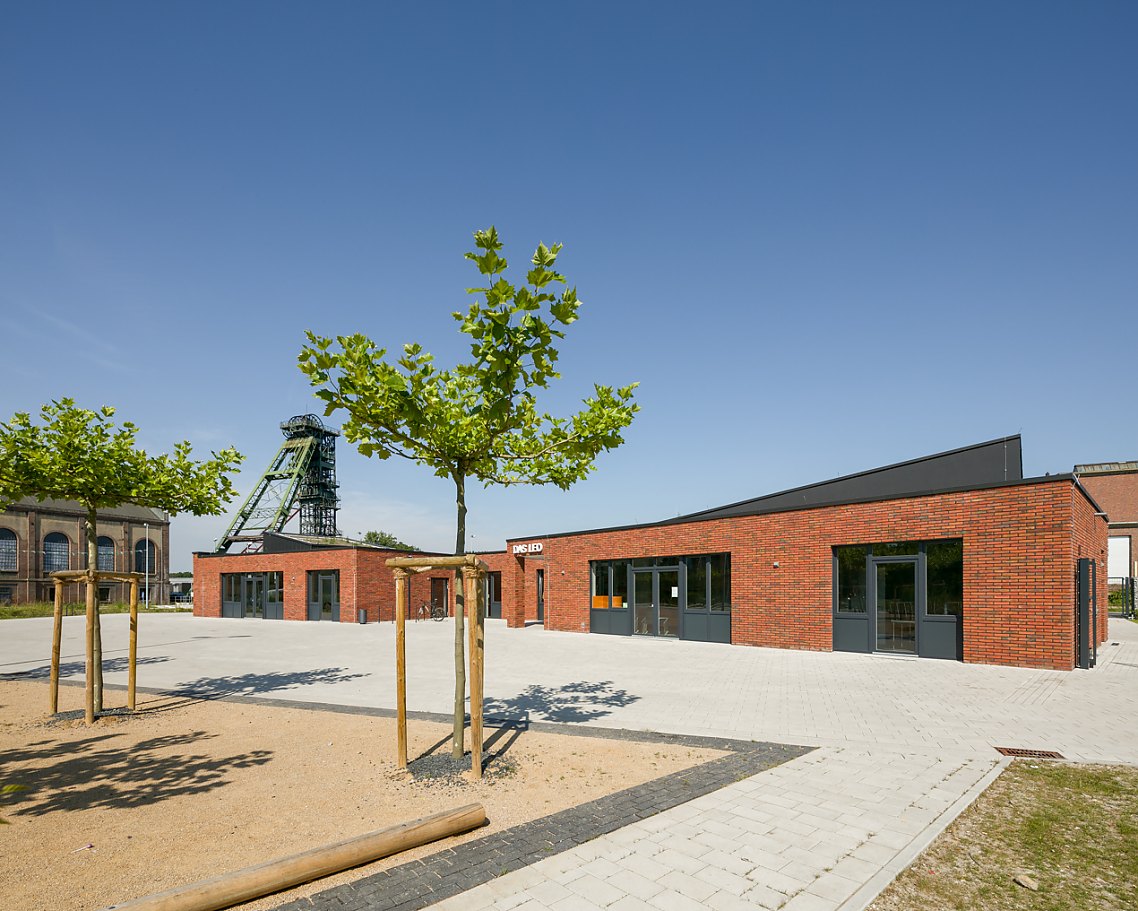 Mehr lesenDie äußere Gebäudestruktur lässt die verschiedenen Nutzungen deutlich erkennen. Sie ist definiert durch einzelne „Schachteln“, die jeweils für ein Nutzungsmodul stehen. Wertigkeit und Nachhaltigkeit waren dem Bauherren – der Stadt Dorsten – sehr wichtig. Dies hat sich auf das Erscheinungsbild äußerst positiv ausgewirkt. Durch die Bereitstellung zusätzlicher Mittel konnte die Fassade mit einem für die Region typischen roten Klinker verkleidet werden.