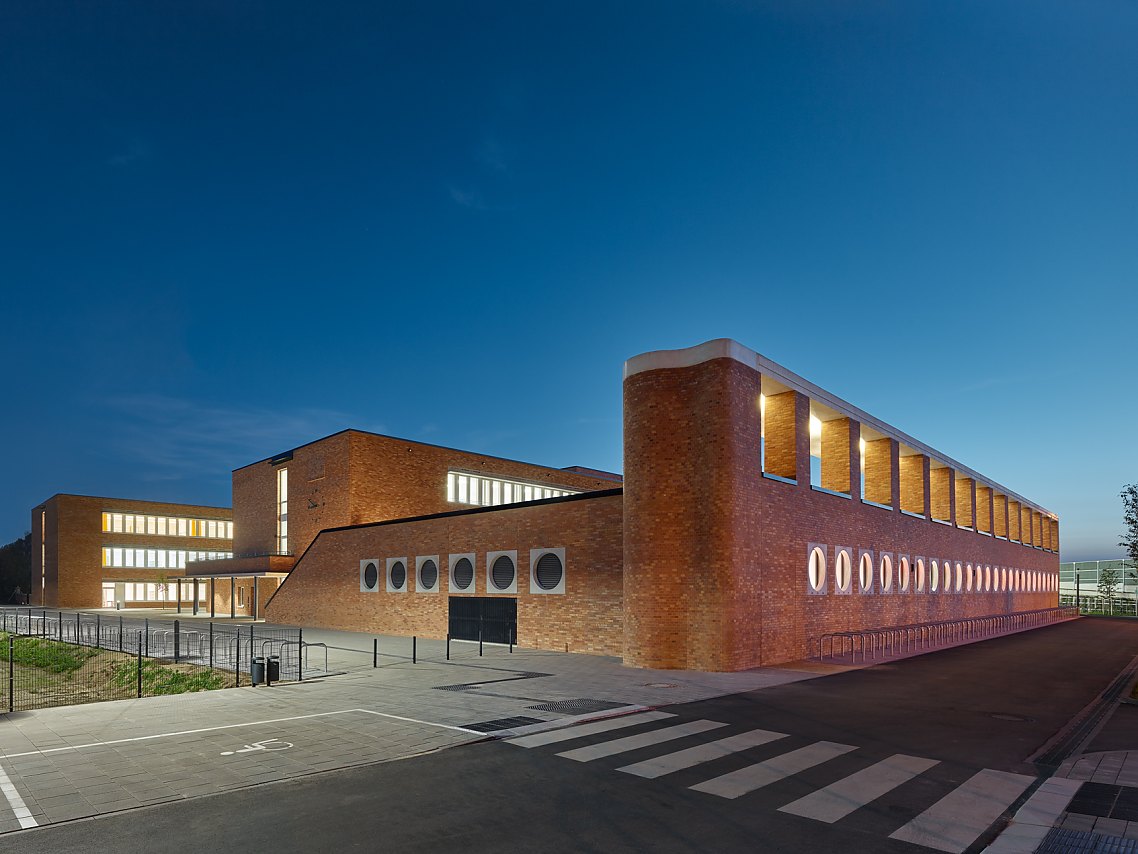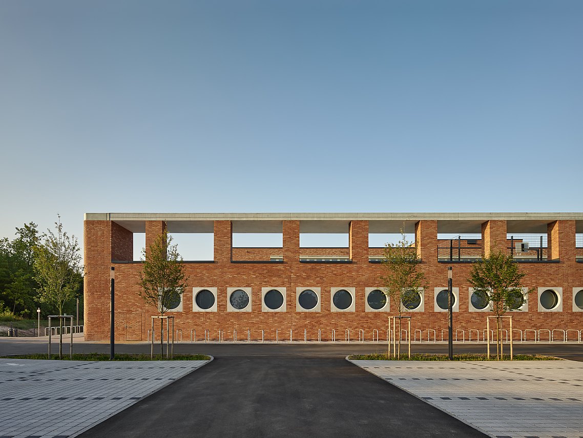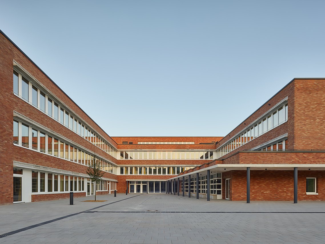 Die Architekten entschieden sich für einen klassisch roten Ziegel, da er am besten das Bild des Gewohnten und dennoch Neuen transportiert. Daneben gab es aber auch ganz praktische Gründe für den Backstein: Er ist robust, dauerhaft sowie kostengünstig und somit einfach ideal für einen hochbeanspruchten Schulbau.