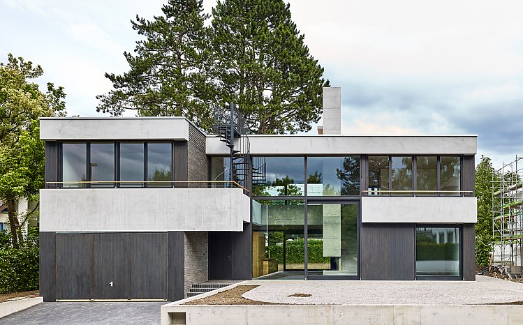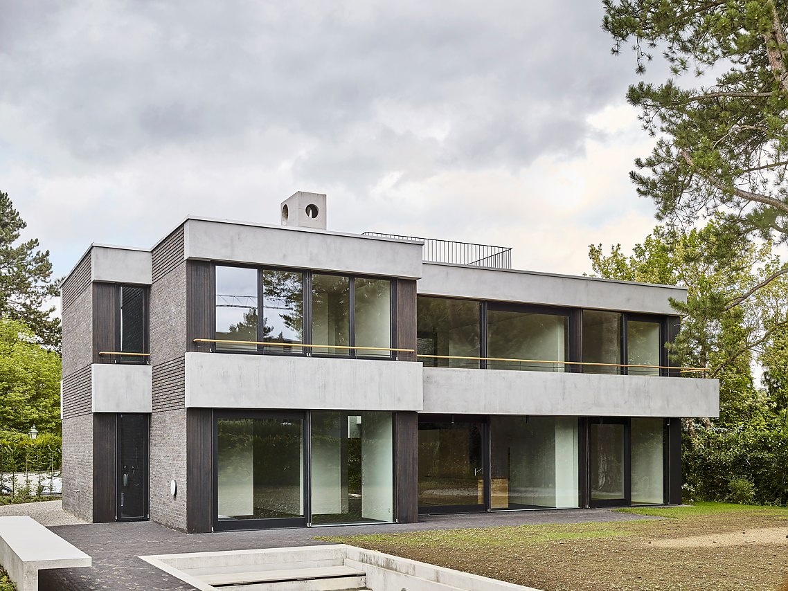Zwei wesentliche Aspekte prägten den Entwurf von Haus H, das in einem attraktiven Wohnquartier auf der Binninger Höhe entstand: Die Ost-West-Orientierung des Grundstücks bestimmte die Setzung des Hauses, das sich großzügig nach Osten und Westen öffnet, sowie die räumliche Ausformung mittels Schottenkonstruktion. Und die beiden alten, mächtigen Schwarzkiefern inspirierten die Architekten zur Verwendung von Backstein in Form handgefertigter, gedämpfter Klinker, die die raue Materialität und Haptik der beeindruckenden Bäume aufgreifen und im Gebäude weiterführen.