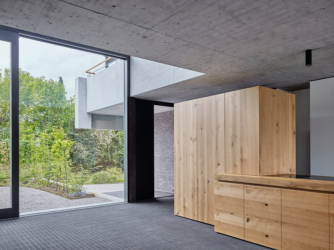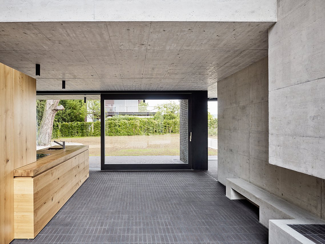 Mehr lesenDas Haus ist als offener Raum über zwei Geschosse konzipiert. Eine zweigeschossige Halle verbindet die zwei Ebenen und bildet mit dem Kamin den zentralen Ort des Hauses. Der Raum weitet sich über diagonale Sichtbezüge zu den seitlich angeordneten Bereichen wie Bibliothek, Kinder- und Elternzimmer aus. Das räumliche Zusammenspiel aus Horizontalität und Vertikalität wird auf der materiellen Ebene weitergeführt und verwebt das Haus zu einem Ganzen.