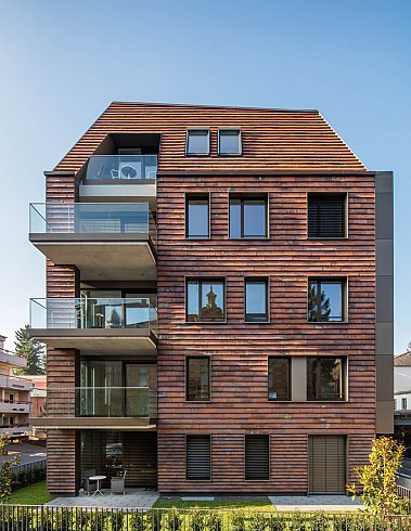 Akkurate Detailanschlüsse in Eloxaltönen für Fassaden, Balkone und Laibungsverkleidungen ergänzen das Gesamtbild. Durch die architektonisch hochwertige Fassade und die städtebauliche Figur entsteht ein zeitlos wertiges Gebäude von hoher Beständigkeit und eigenständiger Ausstrahlung, das sich hervorragend in sein Umfeld einfügt.