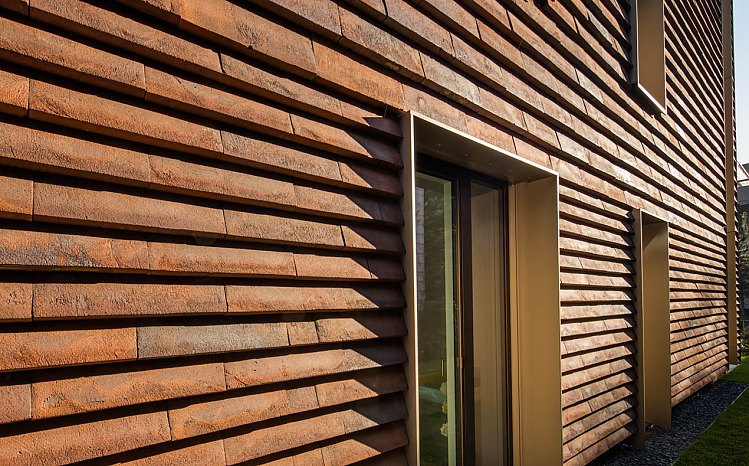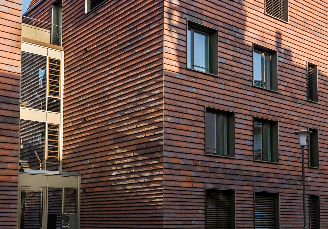 Die verwendeten Ziegel stammen aus der neuen Produktlinie „Cover“ der dänischen Ziegelei Petersen und wurden so in Deutschland erstmals verbaut. Sie sind in Handarbeit aus englischen und deutschen Tonerden hergestellt, in Holzformen geprägt und gebrannt. Durch den handwerklich ausgeführten Brand des Tons entstehen unterschiedliche Nuancen in Farbe und Textur, die der Fassade ihre Lebendigkeit verleihen. Die Ziegel werden als hinterlüftetes Fassaden- und Dachsystem ausgeführt.
