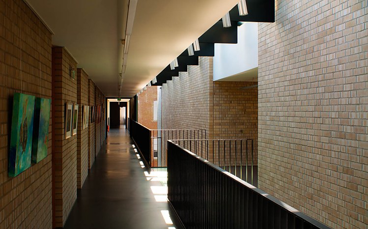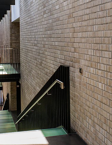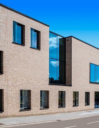 Dafür war ein Klinkerstein zu wählen, der sich hinsichtlich Qualität und Charakter sowohl für die Außenfassade als auch für die Innenräume eignet. Hinsichtlich der Optik fiel die Entscheidung auf einen unaufgeregten, hellen, dezent Ton in Ton changierenden Klinker, der außen die kubischen Formen des Gebäudes unterstreicht und innen für eine ruhige, helle und freundliche Atmosphäre sorgt.
