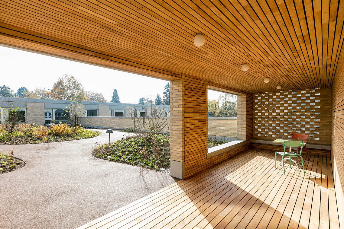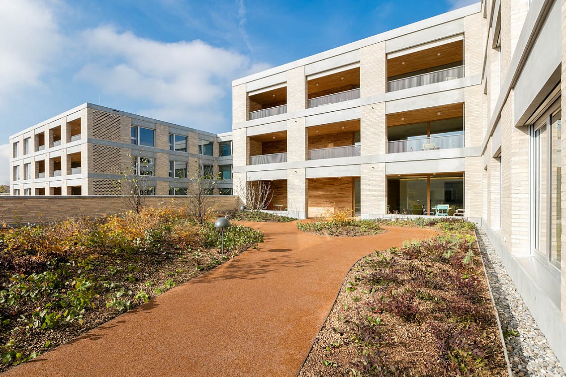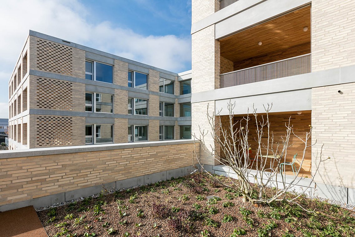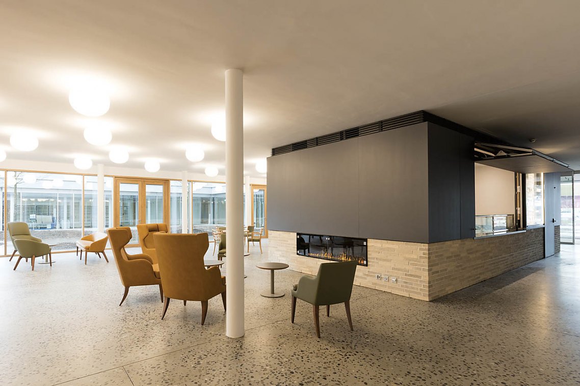 Auch bei der Materialwahl stand das Wohlergehen der Bewohner im Fokus: Warme Farbtöne und hochwertige Naturmaterialien wie Backstein und Eichenholz schaffen eine behagliche Wohlfühlatmosphäre, die lange Bestand haben wird. Backstein ist in unterschiedlicher Funktion in allen Bereichen des Neuen Marthastifts vertreten. Eine Fassade aus massivem Klinkermauerwerk, die teils im Lochmuster verlegten Außenmauern der großzügigen Loggien, niedrige, strukturierende Mauern im Außenbereich und gestalterische Ziegel-Akzente im Innenbereich ergeben ein gelungenes Gesamtbild, das zum Wohlfühlen der Bewohner, Mitarbeiter und Besucher beiträgt.