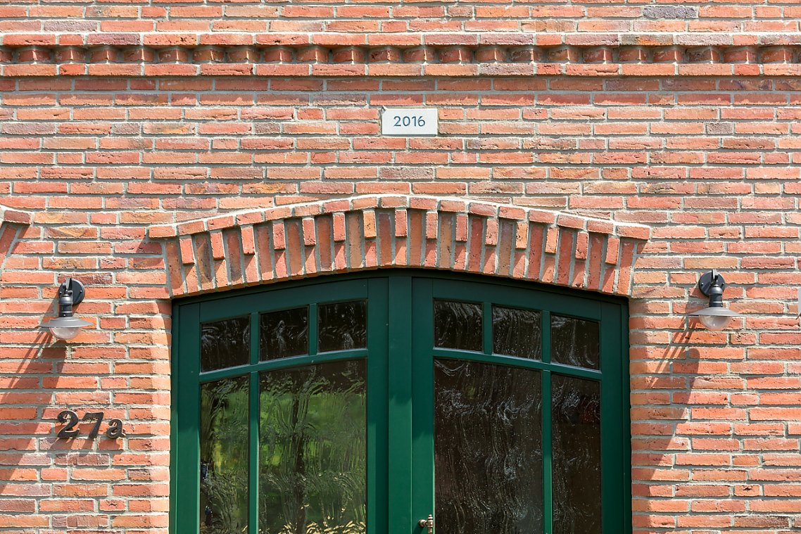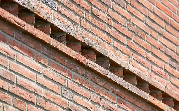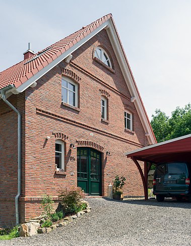 Der „wunderschöne rote Backstein“ – so der Bauherr – ergab sich aus der stilistischen Orientierung des Hauses. Die im Kohlebrand hergestellten, nicht formhaltigen Backsteine aus einer westfälischen Ziegelei unterstreichen mit einer gewissen Rustikalität den ländlichen Charme des Hauses. Zur Auflockerung wurden die Steine im wilden Verband verlegt. Die angedeuteten Säulen an den Seiten sind ein typisches Gestaltungsmerkmal des ausgehenden 19. Jahrhunderts und dienen gleichzeitig als Dehnungsfuge.