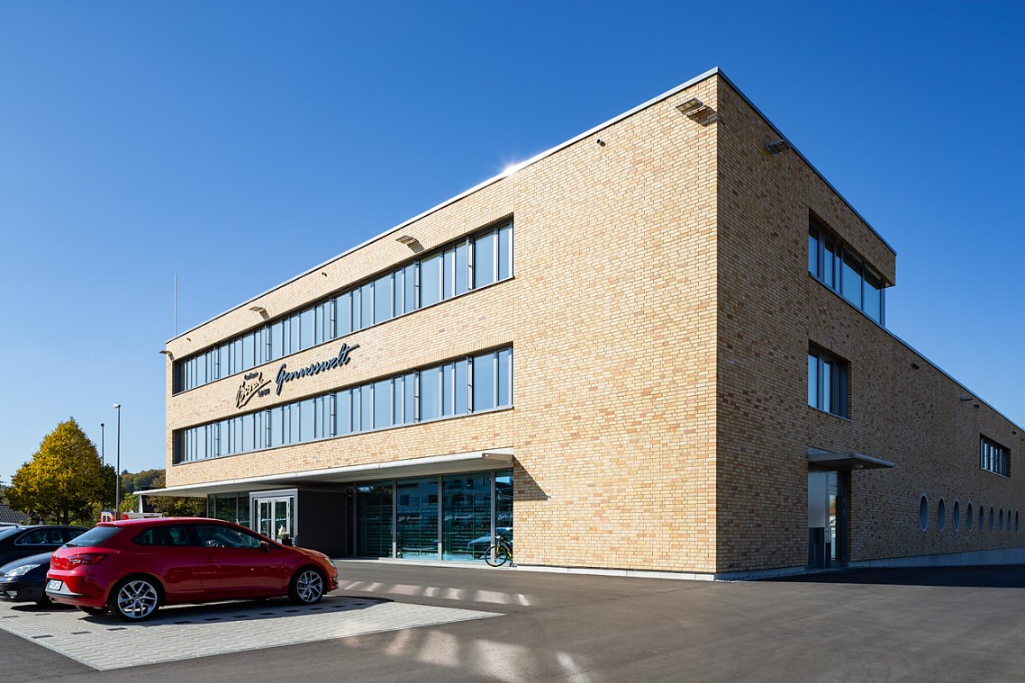 Mehr lesenDas Gebäude ist zur stark befahrenen Stuttgarter Straße als geschlossener Baukörper ausgebildet und öffnet sich auf dem Vorplatz zur Stadtmitte mit den Glasfronten des Showrooms. Die Fassade aus Sichtmauerwerk und Glas verleiht dem Neubau eine hochwertige Ausstrahlung.