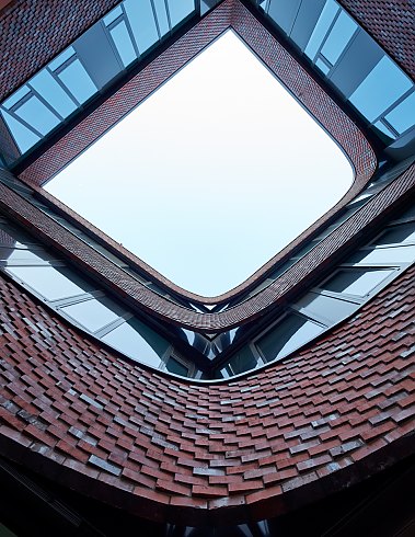 Ein Blick in die Innenhöfe offenbart die technische Raffinesse der Fassadenkonstruktion. Die Klinkerbänder lösen sich in den Ecken von ihrem Untergrund, legen sich in Kurven vor ihn und halten das Gebäude fest zusammen. Das Bauwerk schlängelt sich förmlich über das Grundstück – und wird seinem Namen „The Snake“ mehr als gerecht.