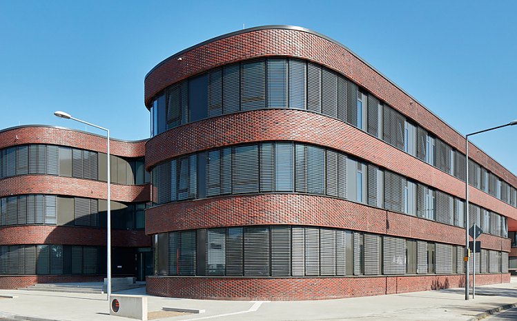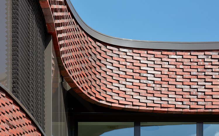 Die Ziegelsteine der umlaufenden Geschossbrüstungen sind speziell geformt, sodass jeder Stein winkelförmig absteht und sich in der Gesamtheit der Eindruck einer geschuppten Schlangenhaut ergibt. Diese Anmutung wird durch die Einzigartigkeit der Oberflächenstruktur und die Farbigkeit eines jeden Ziegels zusätzlich betont. Durch die wechselnde Laufrichtung der Ziegelsteine von Geschoss zu Geschoss ändert die Außenhaut optisch mehrfach die Richtung – sie scheint sich zu bewegen.