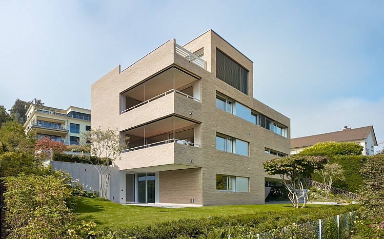 Die wohltuende Ruhe des Backsteins in turbulenter Zeit – diesen fast schon poetischen Grund nennt der projektleitende Architekt Res Kessler auf die Frage, weshalb das Zweifamilienhaus in Hanglage im Schweizer Rüschlikon ein Backsteinkleid bekommen hat. Der Bauherr wünschte sich eine ruhige, unaufgeregte Architektur. Backstein bringt diese Ruhe mit. Die Ruhe des Liegens. Die Ruhe der Wiederholung gleicher Formate. Und die Ruhe eines erdigen Materials.