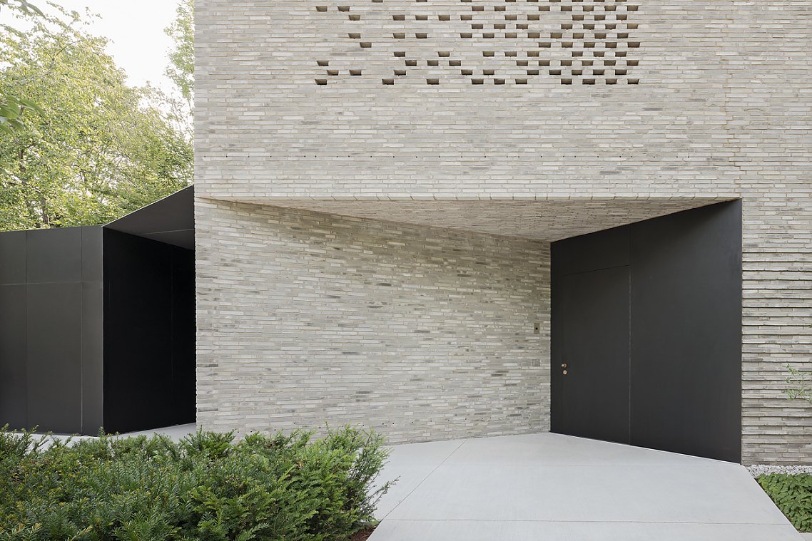Mehr lesenDie Ziegelfassade aus handgefertigten dänischen Steinen im Flensburger Format ist mit Bändern von schichtweise nach innen und außen springendem Mauerwerk überzogen. Der graugrüne Stein unterstützt das burghafte Erscheinungsbild des Wohnhauses, das sich mit seinen geschlossenen Flächen von der Straße abwendet. Die großen Fenster mit ihren schwarzen Umrahmungen betonen dagegen die drei Ecken des Gebäudes und die Hinwendung zum Garten. Die diagonal über das Grundstück verlaufende Hauptfassade ist exakt nach Süden ausgerichtet und öffnet sich im Erdgeschoss mit großen verglasten Flächen in Richtung Garten und Pool.