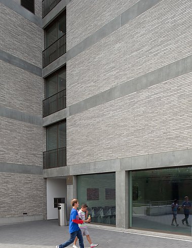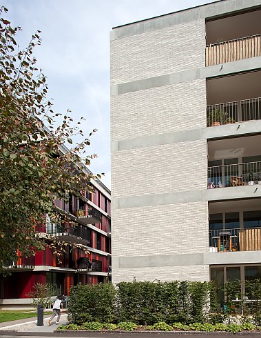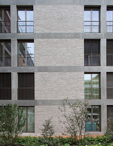 Die Fassaden der Baukörper sind geprägt von einer Gitterstruktur aus rhythmisierten, horizontal geschichteten und vertikal gestellten Betonelementen, raumhohen Glas- bzw. Fenstereinsätzen sowie offenen Loggien und Sichtmauerwerksflächen. Das Zusammenspiel der Materialien von glatten, präzise vorgefertigten Betonelementen und handgefertigten, gedämpften dänischen Backsteinen im dünnen Langformat ergibt dabei ein spannungsvolles Ganzes.