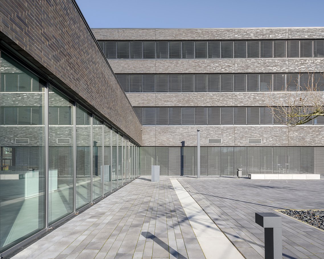 Mehr lesenZu diesem Vorplatz hin orientiert sich der Haupteingang des Neubaus. Der Neubau gliedert sich in einen viergeschossigen Gebäuderiegel mit Büros und Seminarräumen sowie einen überhöhten eingeschossigen Baukörper mit zwei Veranstaltungsräumen. Ein dazwischenliegendes, flacher ausgebildetes eingeschossiges Foyer verbindet beide Gebäudeteile und ermöglicht eine zentrale Erschließung beider Baukörper.