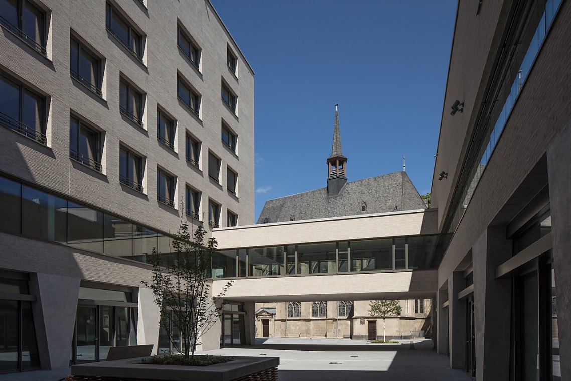 Der gesamte Baukörper steht im Dialog mit der Antoniterkirche. So auch die helle Ziegelfassade, die sich am warmen Naturstein der Kirche orientiert. Der Backstein unterstreicht ideal die ruhige, wertige Atmosphäre dieses innerstädtischen Rückzugsortes.