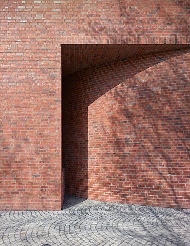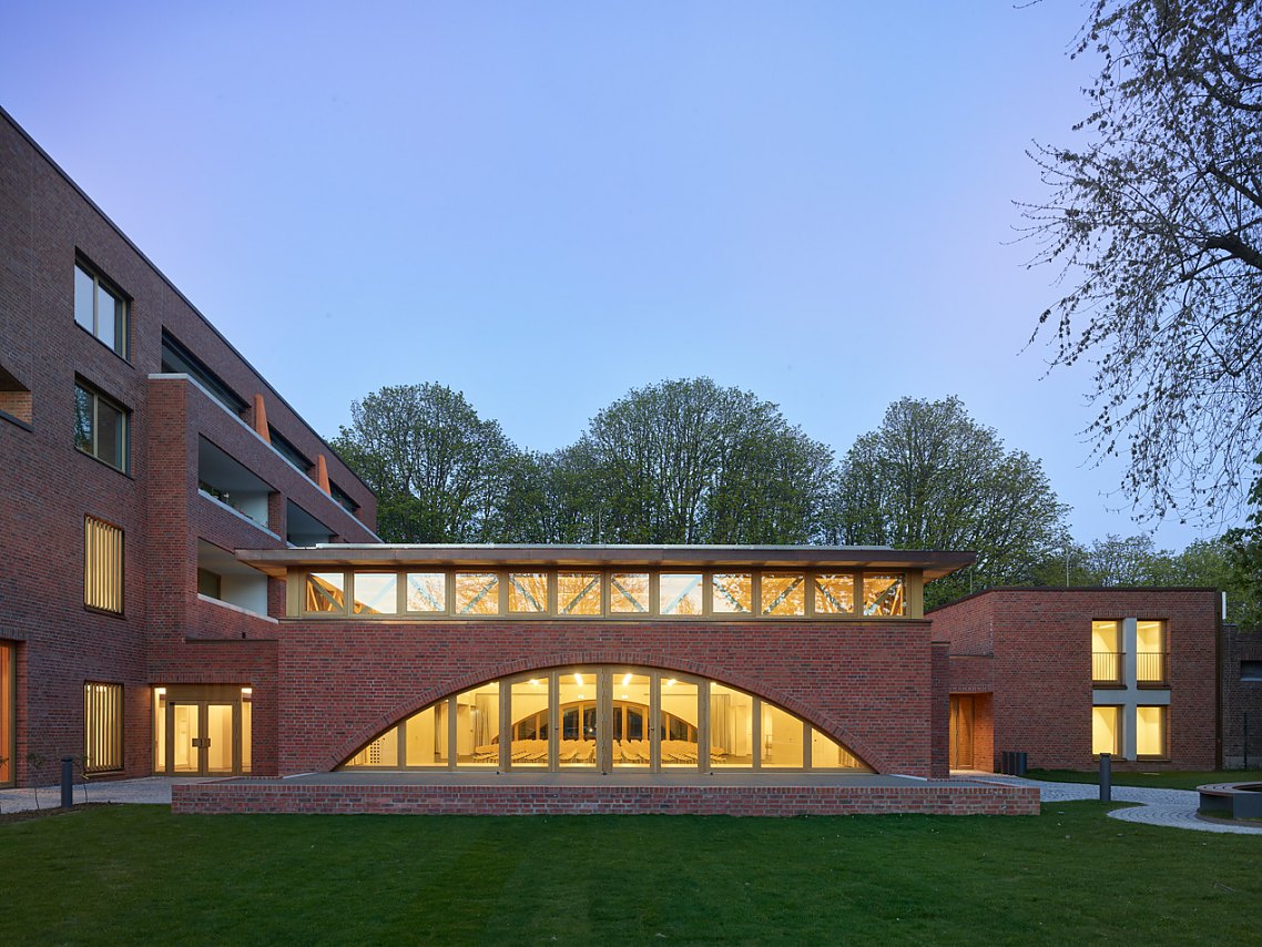 Im Süden fügt sich der dritte Baukörper über zwei Geschosse direkt an die Kirche Christi Auferstehung an. Der markante, teilweise in Backstein ausgeführte Kirchenbau war auch ausschlaggebend für die Materialwahl der Fassade. Das normalformatige Sichtmauerwerk aus Vormauerziegeln orientiert sich in Farbton, Format und Verband an den Bestandsgebäuden. Dabei übernimmt die teilweise Fußsortierung der Vormauerziegel die Haptik der Kirche.