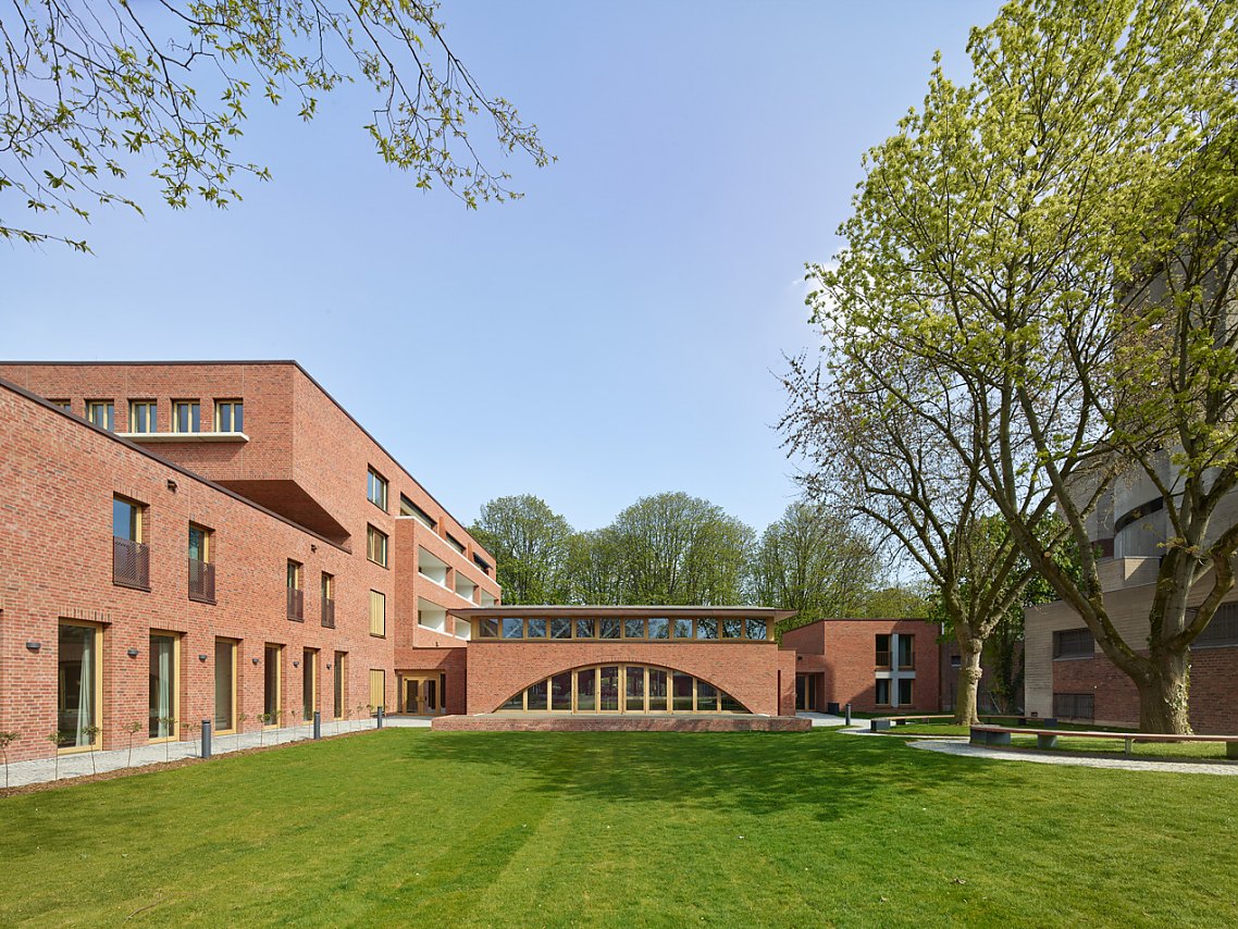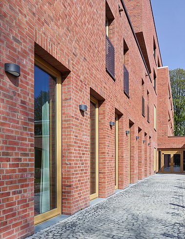 Als weitere Materialen wurden glatt geschalte Betonfertigteile, Eichenholz und Kupfer verwendet. Dank einfühlsamer Architektur und Backstein als verbindendem Element fügen sich die Erweiterungsbauten und der Bestand zu einem harmonischen Ensemble zusammen.