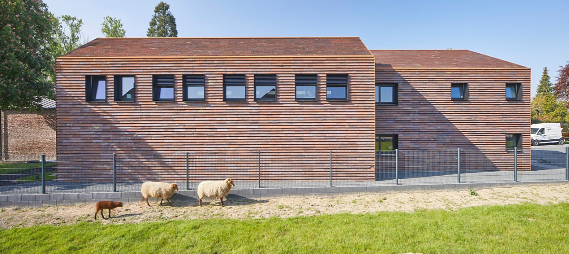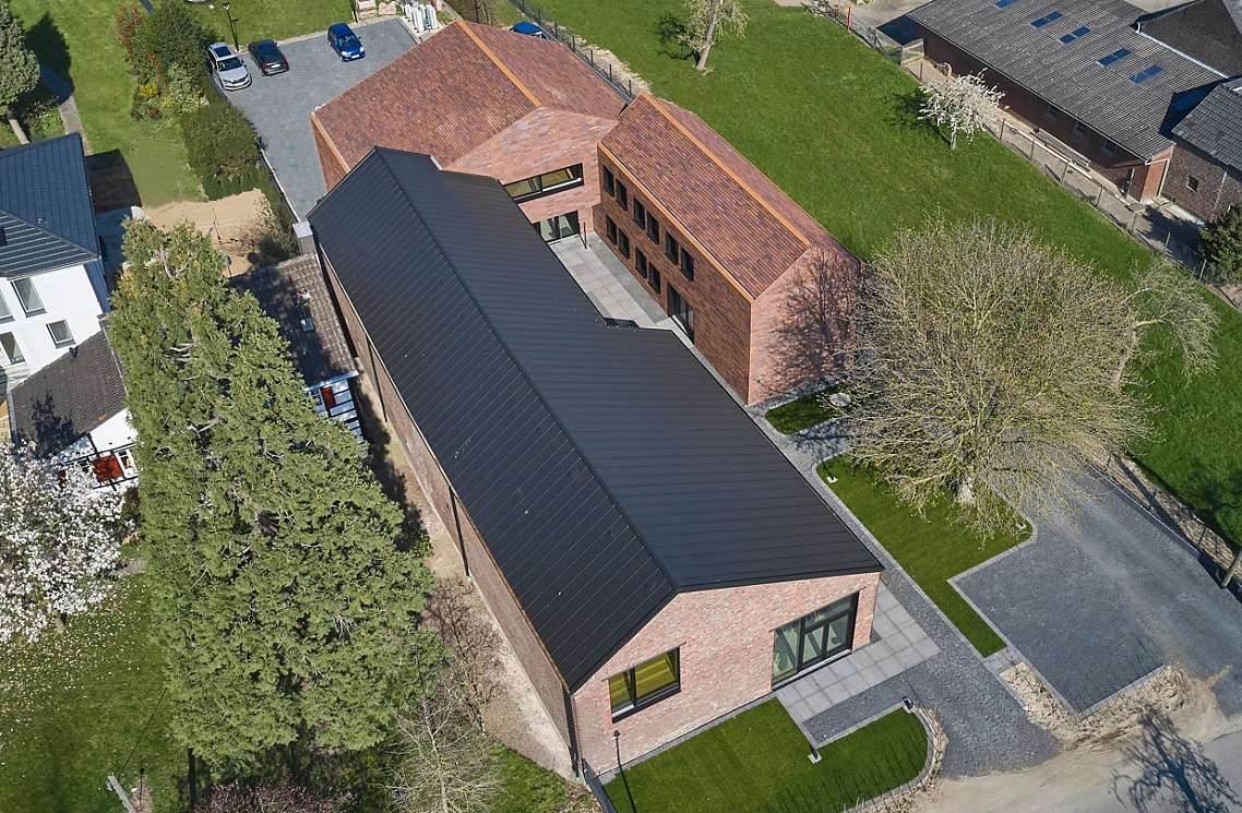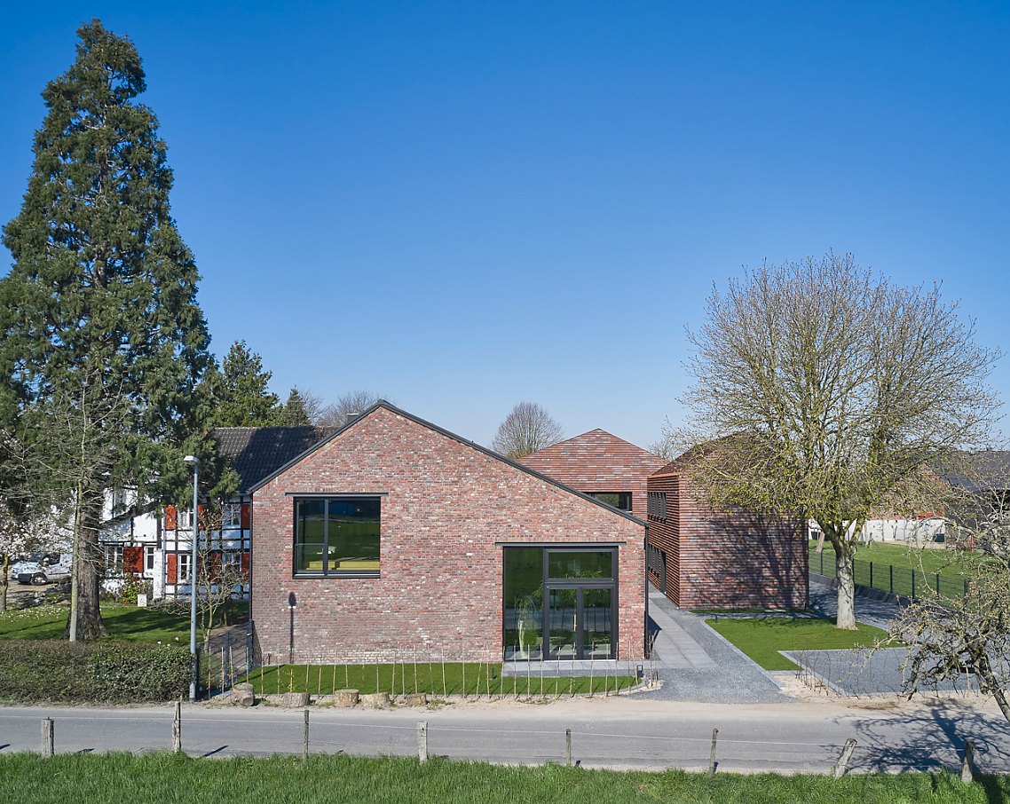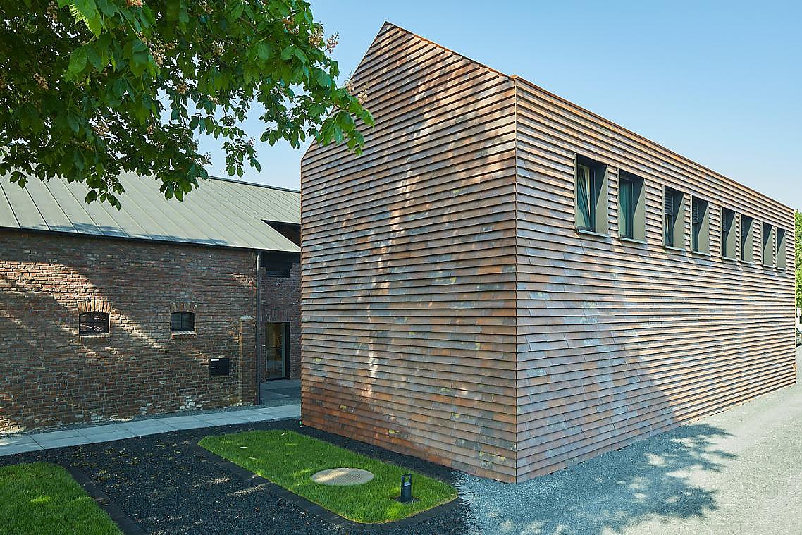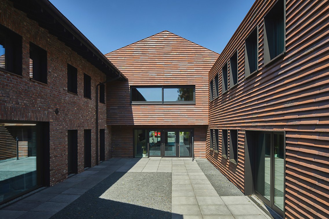 Mehr lesenDie Neubauten erhielten eine Hülle aus handgefertigten Petersen Cover Steinen, die sich in mehrfacher Hinsicht als perfekt erwiesen. So bleiben die neuen Gebäude in der bestehenden Materialität, interpretieren diese aber modern. Zudem verleiht die einheitliche Tonziegeldeckung für Fassade und Dach den Häusern eine skulpturale Anmutung, die die Gebäude auf ihre reine Form reduziert. So erscheint die gesamte Hofanlage zeitgemäß-stilvoll und zugleich historisch verankert.