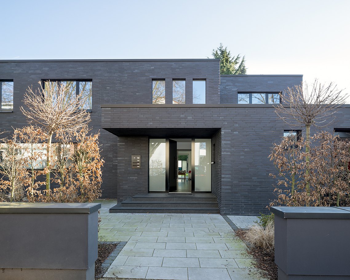 Außen betont schwarzer Klinker die kantige Kubatur. Die Architekten entschieden sich für Backstein, um damit dem eher zerklüfteten Gebäude eine monolithische Anmutung zu geben. Der inhomogene schwarze Klinker erzeugt einen starken Kontrast zur hellen Innenwirkung und bringt das natürlich Steinerne des Werkstoffs zum Ausdruck.