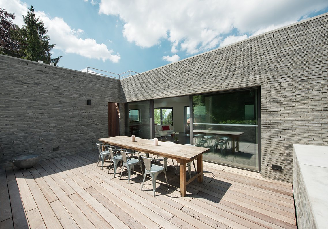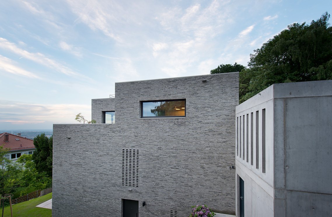 Traumhaus, Traumlage, Traumklinker. So könnte man ganz kurz das dreigeschossige Wohnhaus mit Einliegerwohnung beschreiben, das sich im Stuttgarter Osten an eine Hanglage mit Neckarblick schmiegt. Die Wohnung des Bauherrn erstreckt sich über zwei Etagen, wobei die kreuzförmige Erschließung reizvolle Blicke in alle Richtungen eröffnet und verschiedene Terrassen den Wohnbereich nach außen öffnen.