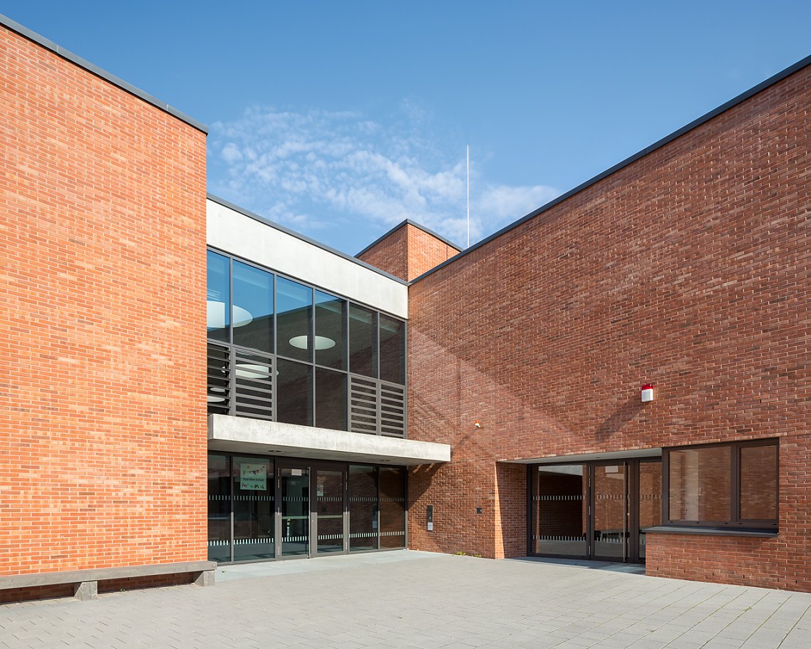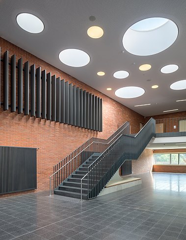 Die warmroten Ziegel der Außenfassade finden sich auch im Innenbereich wieder, wo sie mit hell gestrichenen, ruhigen Wandflächen kontrastieren. In diesem schulischen Umfeld punktet Backstein mit vielen Vorteilen: Er ist robust, langlebig und wartungsfrei und verleiht dem Gebäude gleichzeitig Wertigkeit und Geborgenheit.