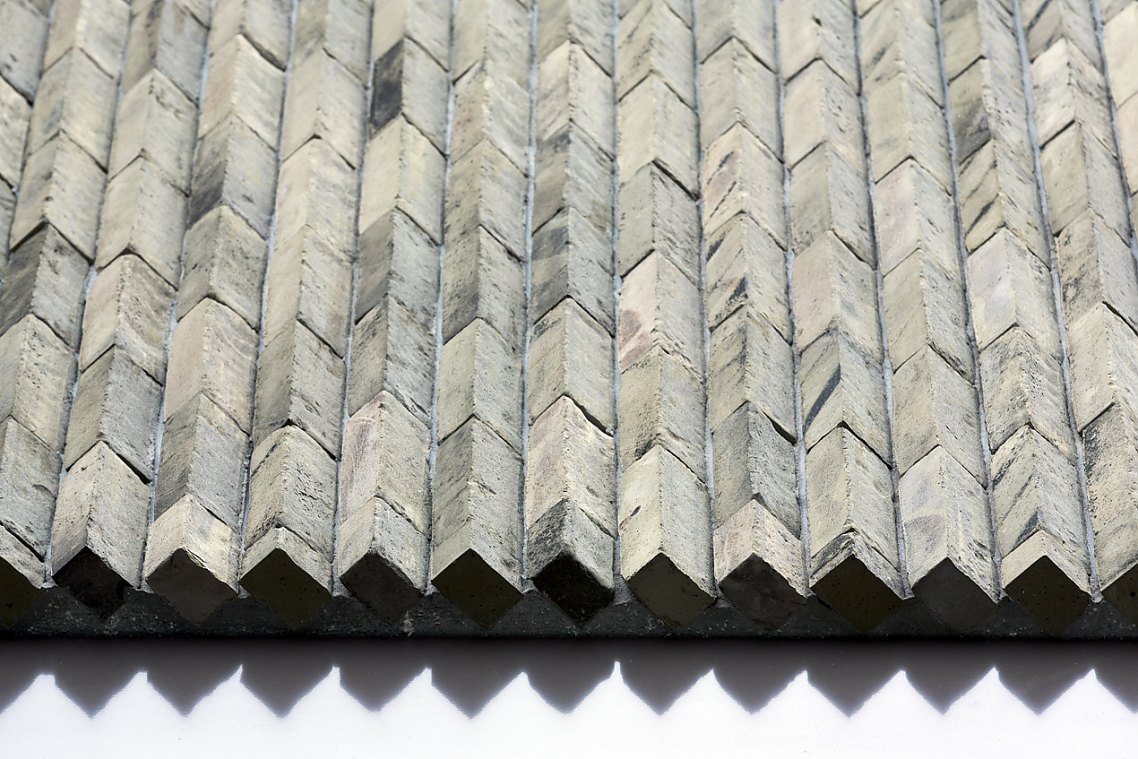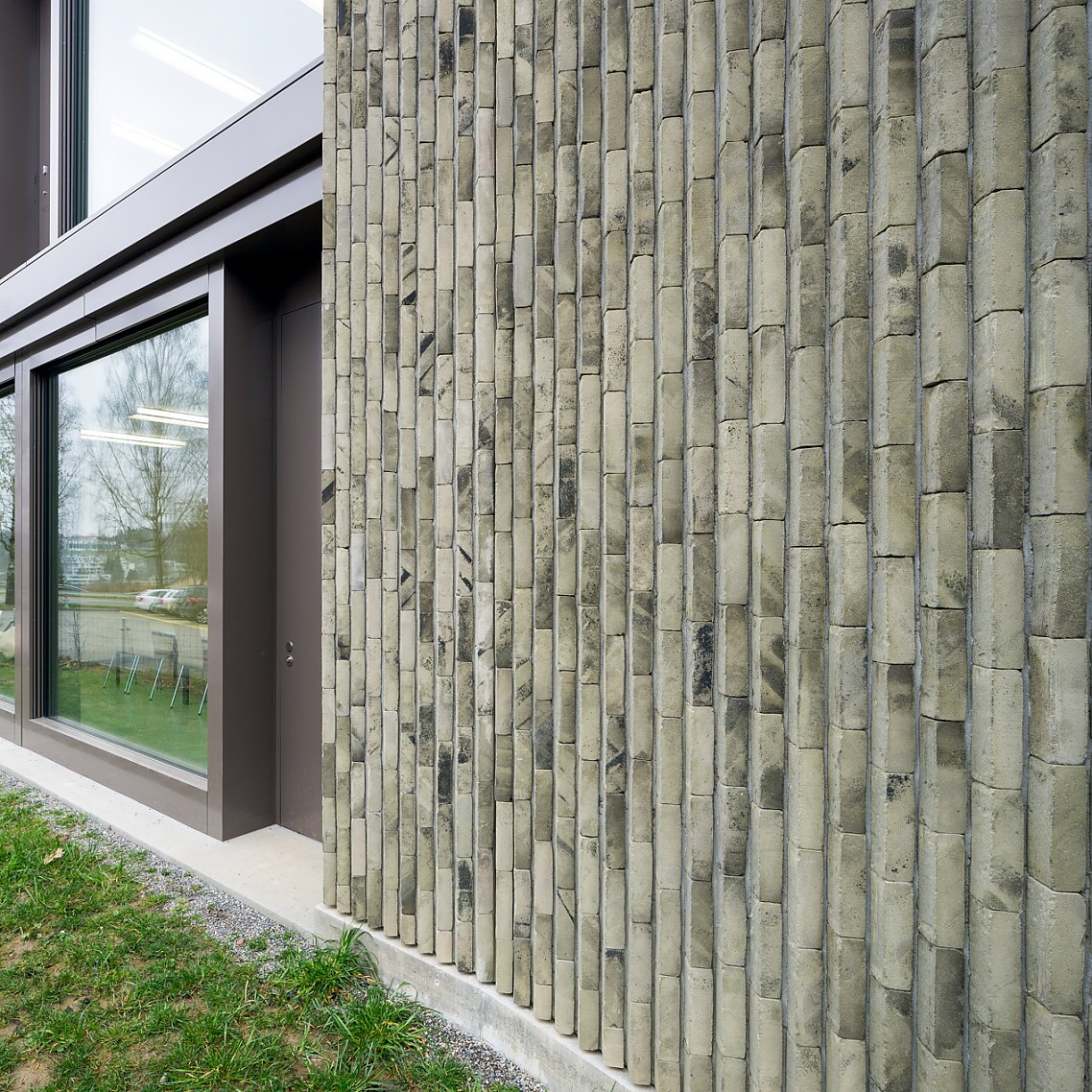 Das Außergewöhnlichste an dem neuen Schulhaus Kopfholz ist jedoch zweifellos sein Backsteinkleid. Statt in horizontalen Schichten sind die Ziegel in vertikalen Streifen angeordnet und verweisen damit ausdrücklich auf ihren nicht tragenden Einsatz. Die vorstehenden Ecken der Steine und die daraus resultierenden Schlagschatten verleihen der Fassade eine lebhafte Körperhaftigkeit.