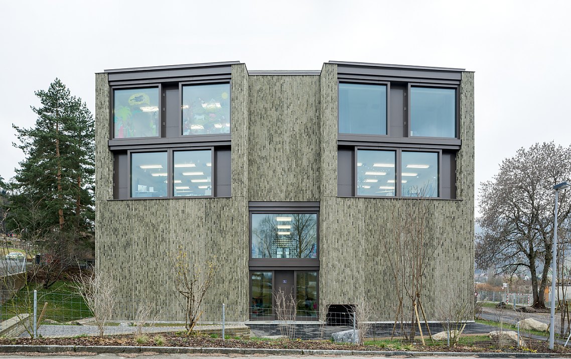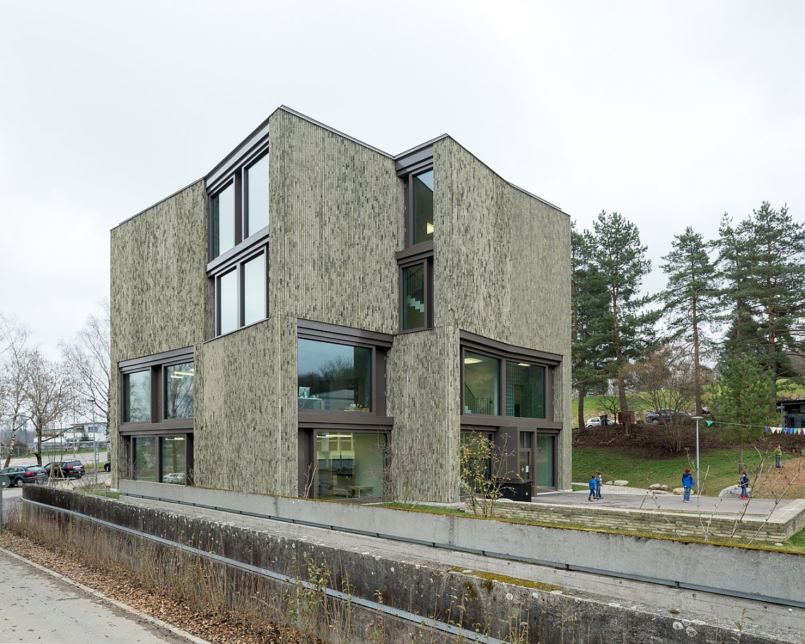 Wie eine Kreuzung aus Turm und Pavillon in einem extravaganten grüngrauen Backsteinkleid wirkt der Erweiterungsbau, der die bestehende Schulanlage aus dem Jahre 1972 ergänzt. Er bietet Platz für dringend benötigte Räumlichkeiten: vier Kindergartenräume, zwei Primarschulzimmer mit Gruppenräumen, Verwaltungsbüros und ganz oben ein großer Singsaal mit weitem Ausblick über das Sihltal.