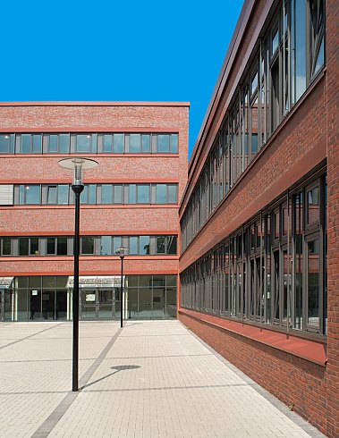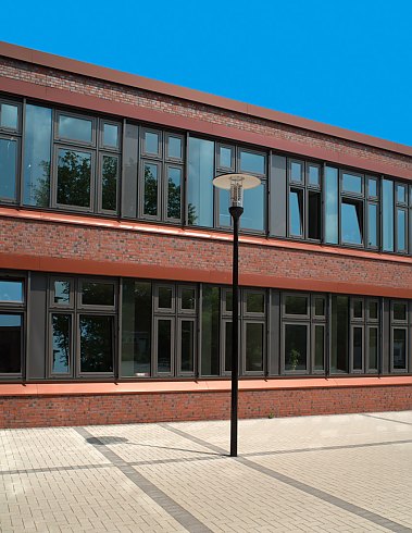 Ein sehr schönes Beispiel dafür ist das Alfred Müller Armack Berufskolleg in der Brüggener Straße in Köln. Hier wurden die alten tristen Fassaden aus Waschbeton und Betonfertigteilen bis auf wenige Beton- und Mauerwerksausfachungen zwischen den Stützen zurückgebaut. Die Fassade wurde energetisch ertüchtigt und mit einem klinkerverkleideten Wärmedämmverbundsystem ausgestattet. So kann Energiesparen richtig gut aussehen!