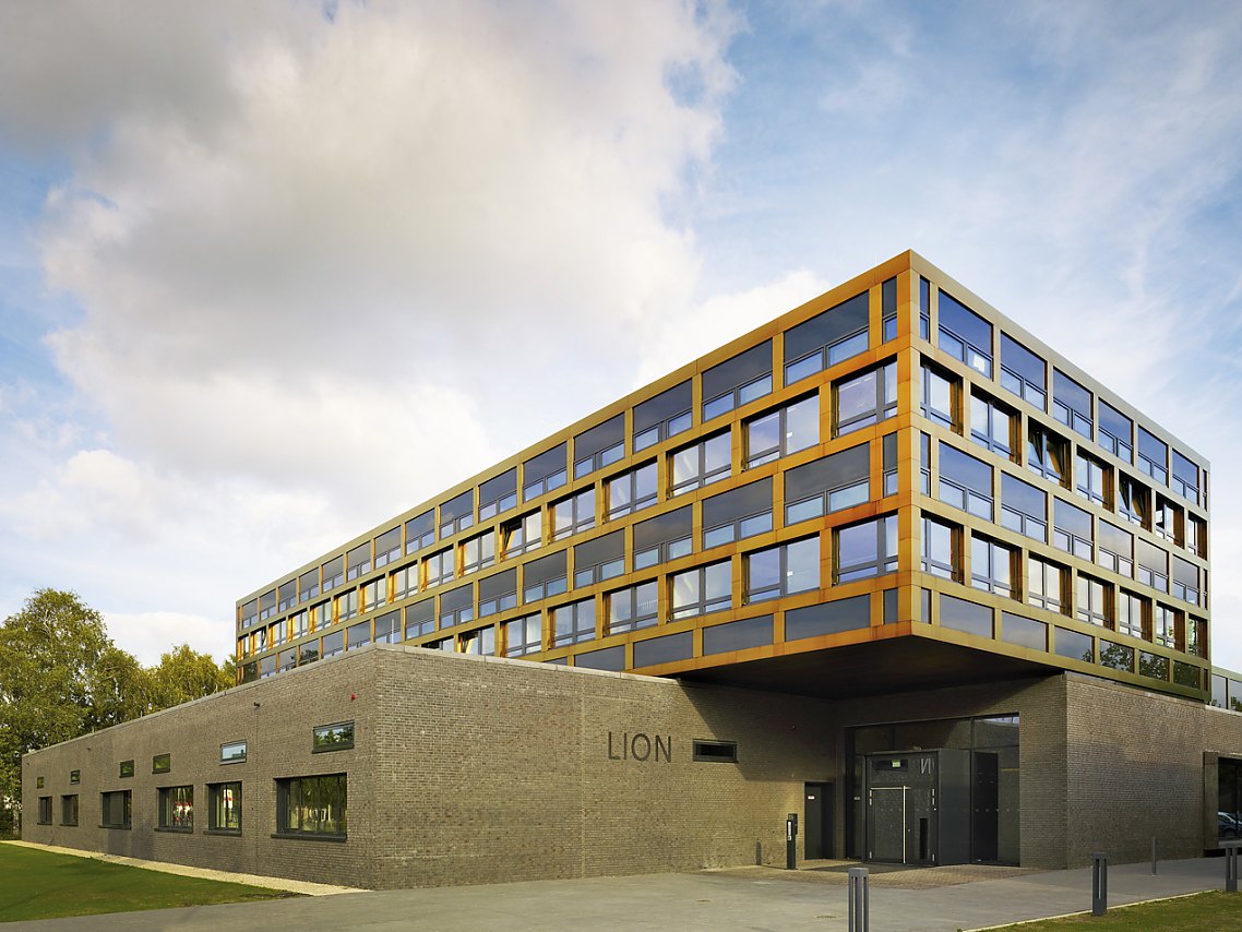 Das Institut für Licht und Optische Technologien der Universität Bremen (LION) glänzt im wahrsten Sinne des Wortes mit einem eindrucksvollen Forschungsneubau, der durch zwei Elemente geprägt wird: einen massiven Klinkersockel und zwei goldfarbene edelstahlverkleidete Kuben mit stützenfreier Versuchshalle und zweigeschossigem Büroriegel.