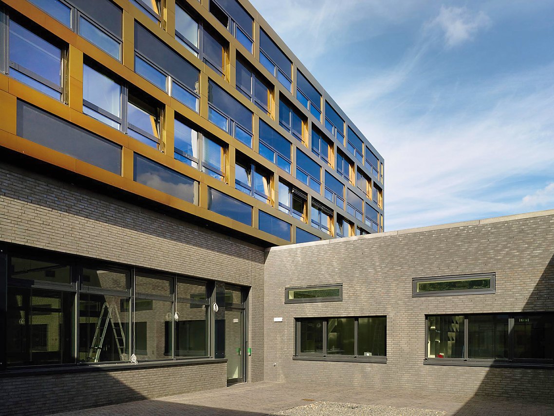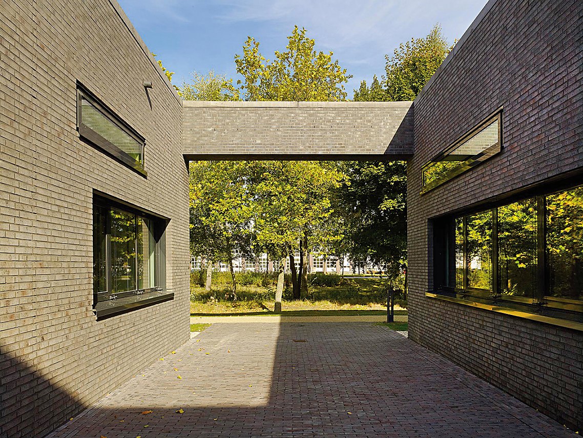 Das klinkerverkleidete Sockelgeschoss nimmt Nebenräume der Versuchshalle, öffentliche Seminarflächen und das Foyer auf. Mit dieser Struktur folgen die Architekten von ksg ihrem bewährten architektonischen Konzept für Forschungsbauten, bei dem sich innere Organisation und Gegenstand der Forschungsarbeit in der Fassadengestaltung abzeichnen. In diesem Ensemble nimmt das Ziegelmauerwerk eine zurückhaltende, tragende Nebenrolle ein und stellt gleichzeitig eine Verbindung zu den umliegenden Gebäuden her.