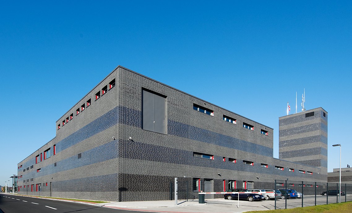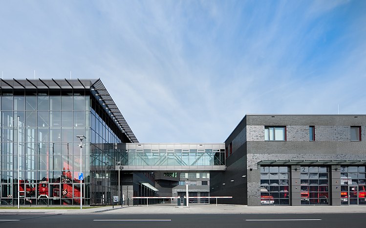 Bei der Planung der Hauptfeuer- und Rettungswache Mülheim an der Ruhr stand die Funktionalität im Fokus. Eine Feuerwehr muss vor allem schnell sein. Kurze Wege waren deshalb eine zentrale Anforderung an das Gebäudekonzept. Gebäudeteile mit den unterschiedlichsten Funktionen gruppieren sich um einen großflächigen Innenhof und bilden einen geschlossenen Gesamtkomplex.