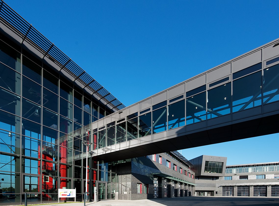 Mehr lesenArchitektonisch fällt vor allem der gelungene Kontrast zwischen lichtem Glas und großflächigen, anthrazitfarbenen Klinkerfassaden auf. Bei den Verblendmauersteinen wechseln sich Bereiche mit glänzender und matter Oberfläche ab. Dadurch entsteht eine ruhige, horizontal gebänderte Fassadenordnung, deren Stringenz bei unterschiedlichem Tageslichteinfall und Betrachtungswinkel von einem spannungsvollen optischen Effekt aufgelockert wird.