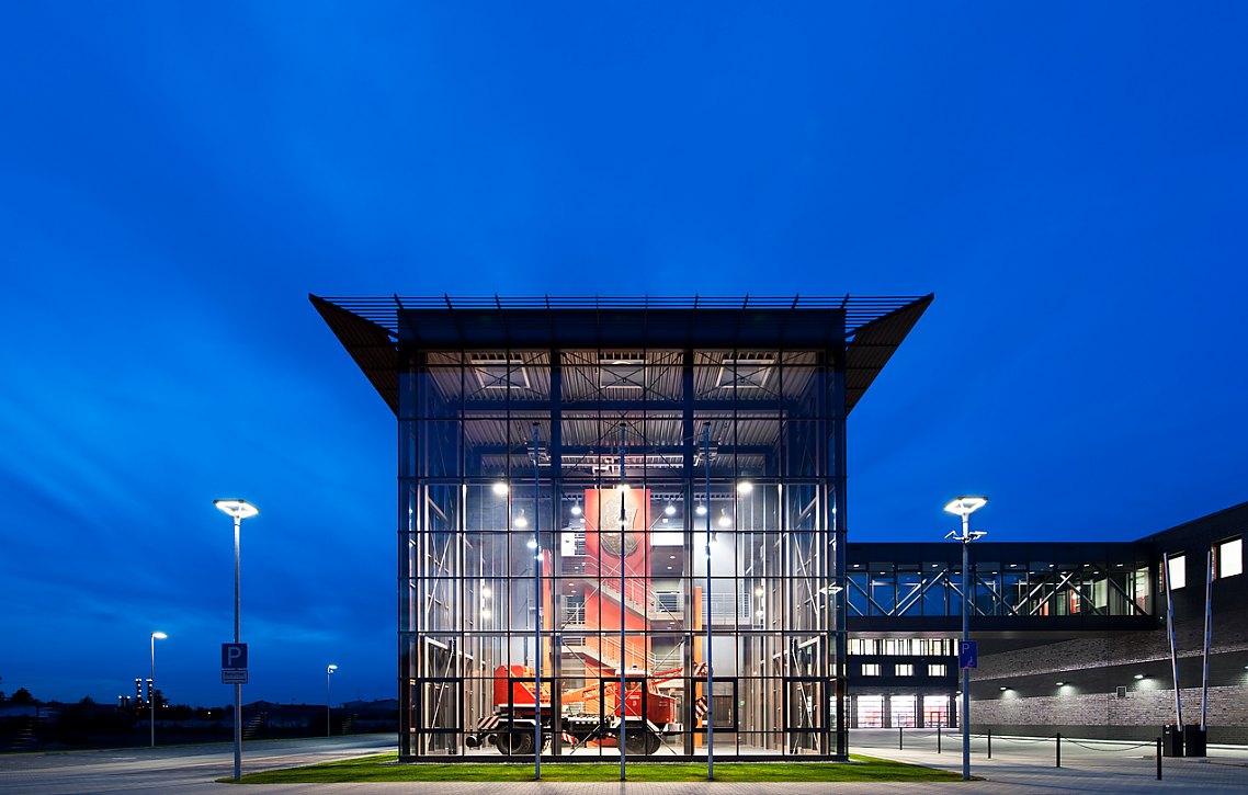 Das Material Backstein fügt sich hervorragend in das Gesamtensemble ein, das Technologie, Sicherheit und Beständigkeit einer modernen Feuerwache stimmig nach außen repräsentiert.
