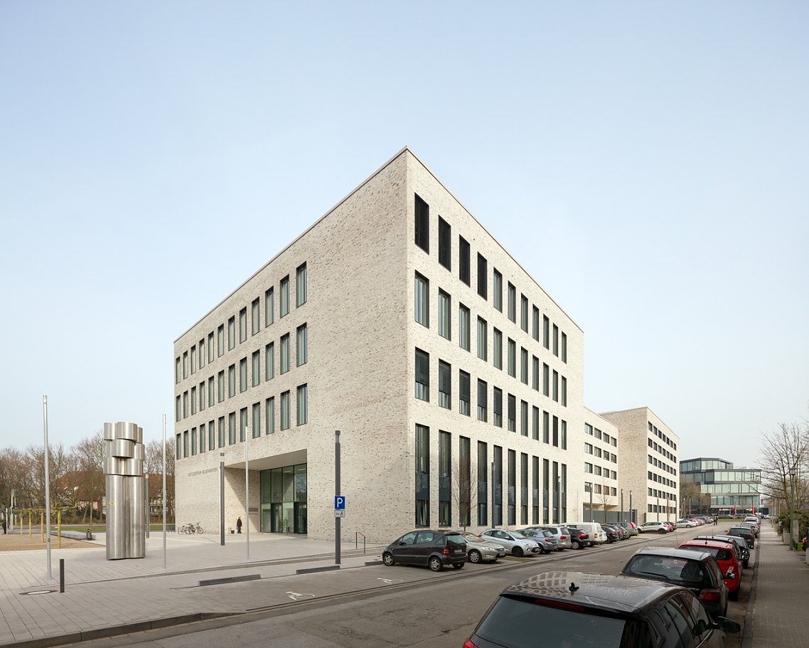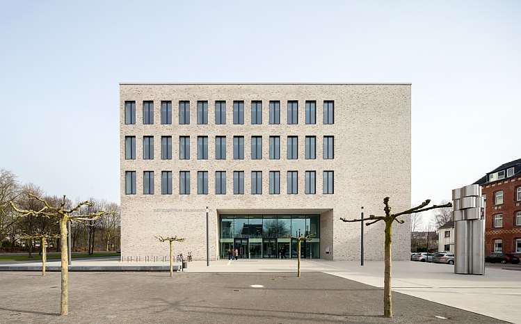 Mehr lesenDie äußere Erscheinung des Neubaus wird durch die Materialität des Klinkers bestimmt. Seine gleichmäßige Textur unterstreicht die skulpturale Wirkung des Gebäudes, während der „menschliche Maßstab“ des Materials die Bürgernähe des Gebäudes transportiert.