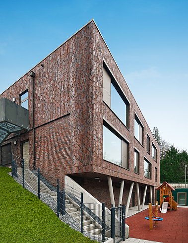 Mehr lesenEntwurfsplaner Prof. Henner Herrmanns wollte ein Gebäude schaffen, das einen starken Bezug zur existenten Bebauung aufweist, aber dennoch eine eigenständige Ausstrahlung hat. Die Architektur sollte zeitlos, dauerhaft und nachhaltig sein. Diese Ansprüche lieferten eine Steilvorlage für Backstein: Der existente Kita-Altbau trägt eine Klinkerfassade. Und in Sachen Zeitlosigkeit und Dauerhaftigkeit ist Backstein einfach unschlagbar.