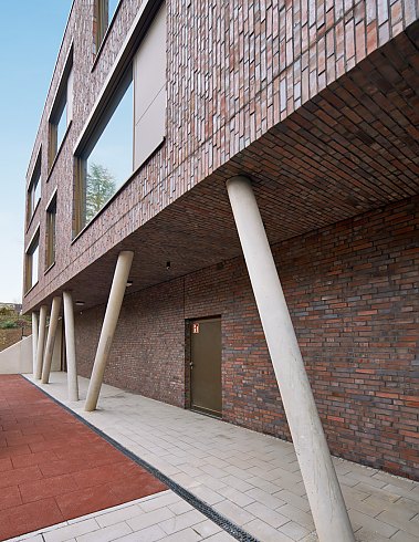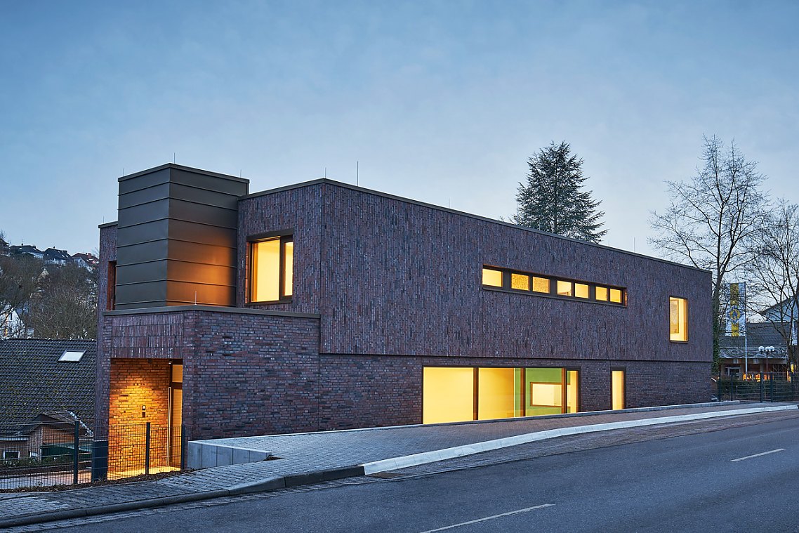 Nach einem besonderen Detail befragt, das alles über das Gebäude selbst aussagt, nennt Prof. Henner Herrmanns die Klinkerfassade. Der rötliche Verblendstein mit ausdrucksstarker Textur betont das moderne Erscheinungsbild des kubischen Baukörpers und stärkt die Präsenz des kleinen Anbaus. Eine Besonderheit, die sofort ins Auge sticht, ist die senkrechte Verlegung der Klinker. Die andere Besonderheit sieht man nicht: Hinter der Backsteinschale steht nämlich ein Holzbau. Die Verlegung von Klinkerriemchen auf einem Holzrahmenbau ist in Deutschland fast einzigartig.
