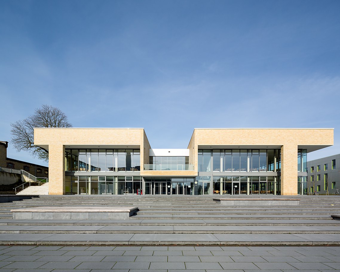 Mehr lesenIn Anlehnung an die benachbarten Gebäude der ehemaligen Von-Stein-Kaserne nimmt der Neubau Maßstäblichkeit, Material und Farbigkeit des Bestands auf. So entsteht ein homogenes Erscheinungsbild und der Neubau findet wie selbstverständlich seinen Platz zwischen den historischen Gebäuden am Westerberg.