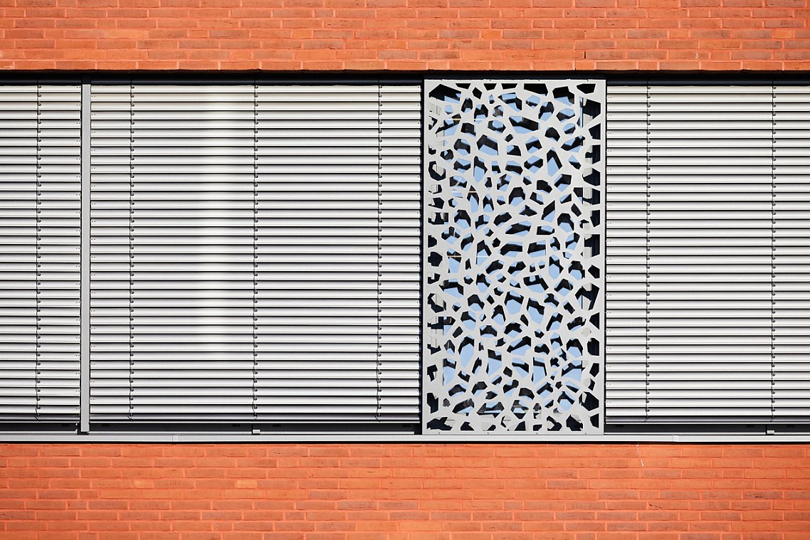 Mehr lesenSo wird die horizontale Fensterbandstruktur des 60er-Jahre-Baus der Bestandsschule übernommen und neu interpretiert: Lochbleche mit Kohlestruktur erinnern an die Ibbenbürener Bergbautradition und ermöglichen gleichzeitig eine Nachtauskühlung bei offenem Fenster. Nicht verglaste Bereiche der umlaufenden Fensterbandstruktur sind mit einem Muster aus vor- und zurückspringenden Klinkern verkleidet, was der Fassade zusätzliche Lebendigkeit verleiht.