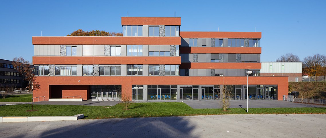 Der viergeschossige Erweiterungsbau der neuen Gesamtschule Ibbenbüren wurde als Solitär vor dem Bestandsgebäude errichtet und nimmt den vorhandenen Höhenversprung auf dem Schulgelände auf. Um den Neubau gut in das Gesamtensemble zu integrieren, knüpft er hinsichtlich Materialität und Struktur der Fassaden an die Bestandsgebäude an.