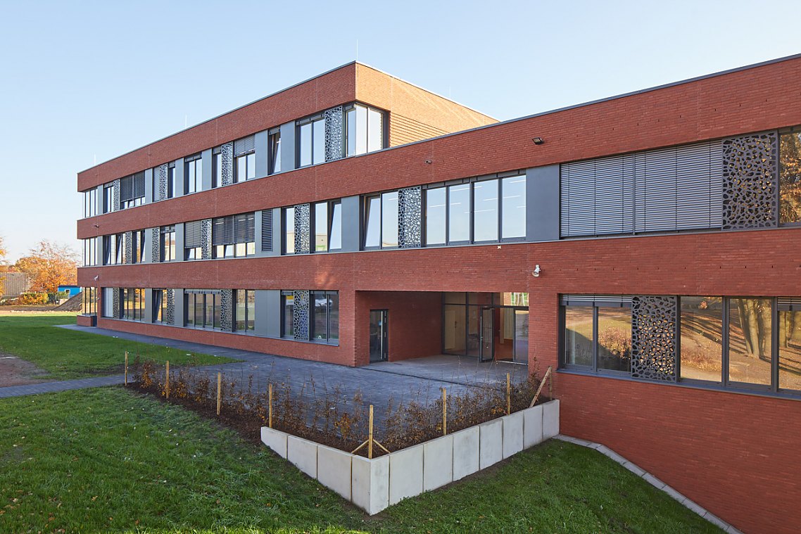 So demonstriert die rote Klinkerfassade des Neubaus gleichzeitig Zugehörigkeit und Selbstständigkeit – und das gesamte neue Schulgelände präsentiert sich als konsistentes, gewachsenes Ensemble.