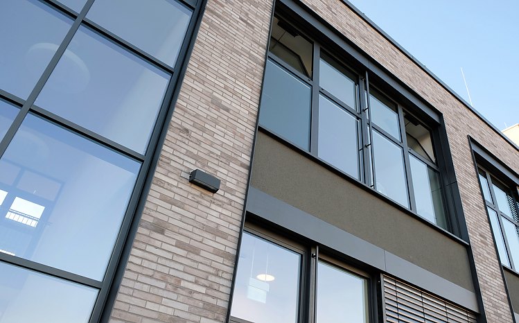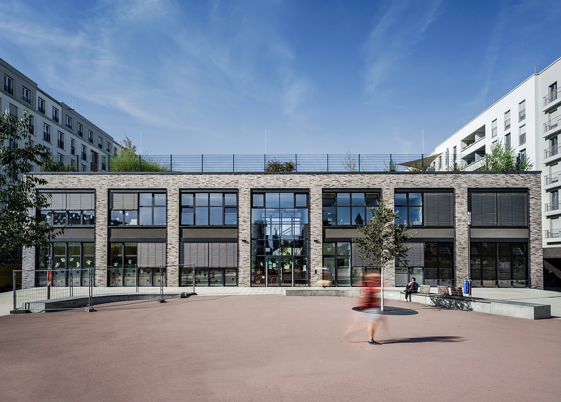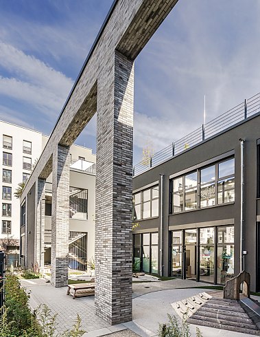 Mehr lesenWeil sich das Gebäude direkt an der Grundstücksgrenze befindet, ist eine der notwendigen Freiflächen auf dem Dach platziert. (Welt-)Offenheit signalisieren auch die großen Fensterflächen, die durch eine Ziegelfassade in verschiedenen Grautönen gefasst sind. Der Backstein verleiht dem Gebäude Lebendigkeit, Erdung und eine besondere Wertigkeit, die zum anspruchsvollen Bildungskonzept des KidsCamps passt.