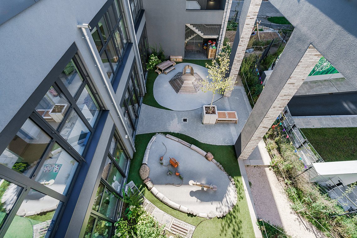 Das KidsCamp am Frankfurter Tel-Aviv-Platz ist in vieler Hinsicht etwas Besonderes: Die Kinder werden bilingual betreut und erlernen so spielerisch vom ersten Lebensjahr an die deutsche und die englische Sprache. Sprachen bauen bekanntlich Brücken. Das spiegelt in diesem Fall auch die Architektur wider, denn die internationale Kindertagesstätte ist als Brückenbau auf einer zentralen Achse mit Blick auf die Frankfurter Skyline ausgeführt. Auch beim Spielen im Freien genießen die Kleinen einen erweiterten Horizont.