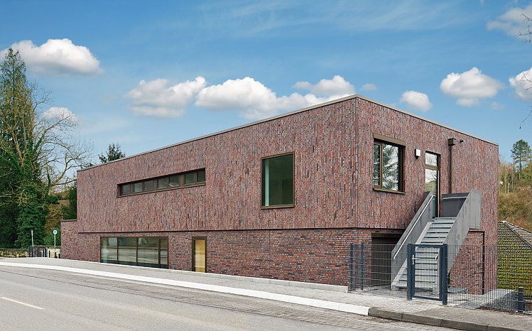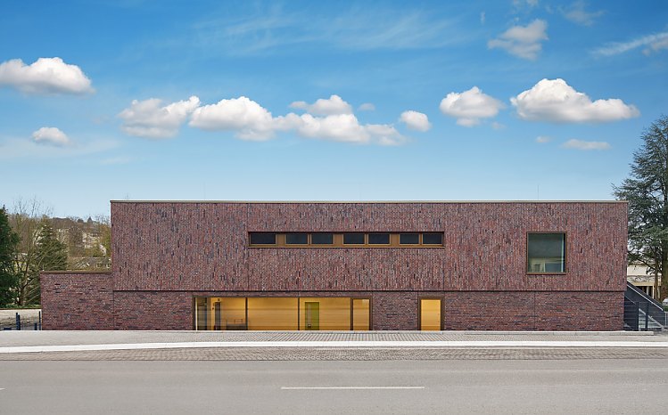 Nach einem besonderen Detail befragt, das alles über das Gebäude selbst aussagt, nennt Prof. Henner Herrmanns die Klinkerfassade. Der rötliche Verblendstein mit ausdrucksstarker Textur betont das moderne Erscheinungsbild des kubischen Baukörpers und stärkt die Präsenz des kleinen Anbaus. Eine Besonderheit, die sofort ins Auge sticht, ist die senkrechte Verlegung der Klinker. Die andere Besonderheit sieht man nicht: Hinter der Backsteinschale steht nämlich ein Holzbau. Die Verlegung von Klinkerriemchen auf einem Holzrahmenbau ist in Deutschland fast einzigartig.
