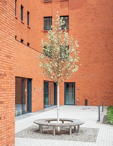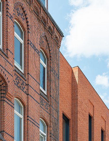 Aber die Herausforderung hat sich gelohnt: Dieser besondere rote Ziegel sorgt im Zusammenspiel mit der sensiblen Formensprache einfach perfekt dafür, dass sich der Neubau wie selbstverständlich in sein Umfeld integriert und gleichzeitig eine eigenständige Präsenz entfaltet.