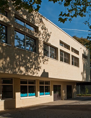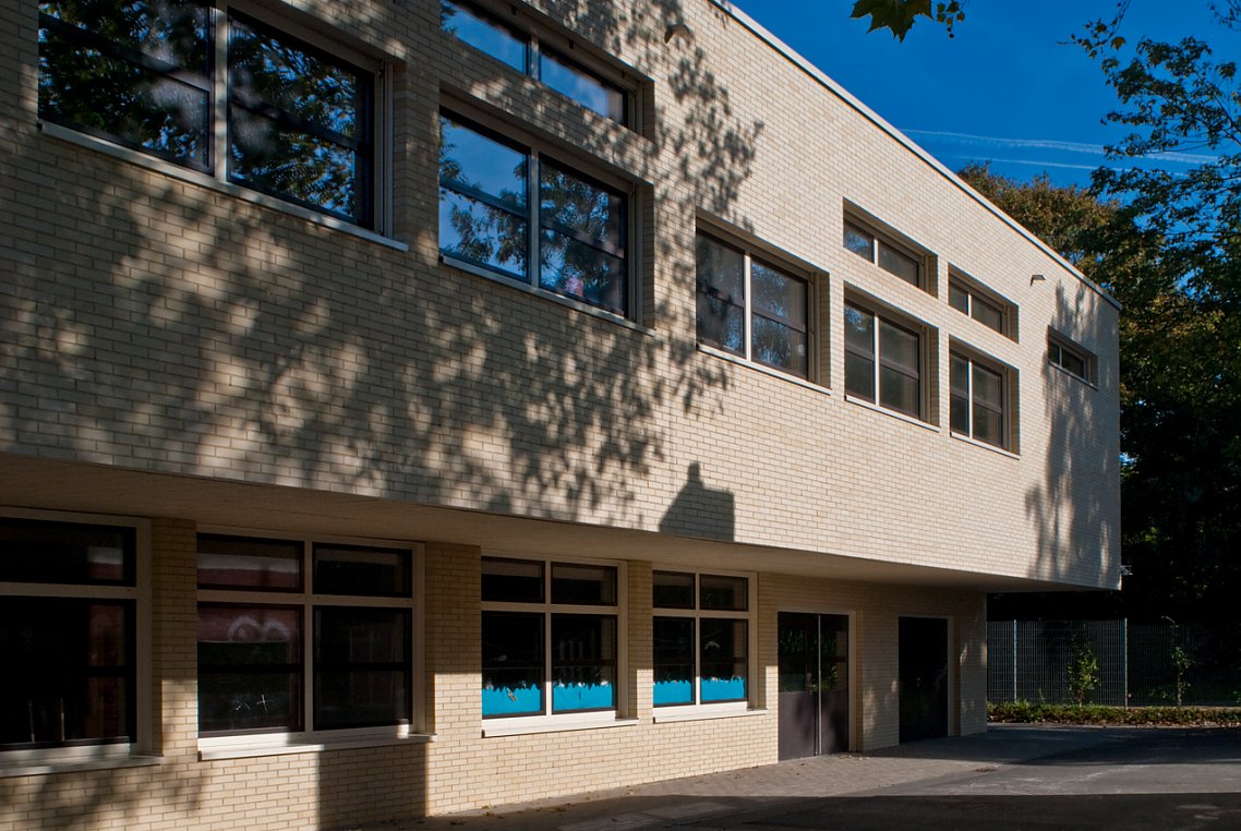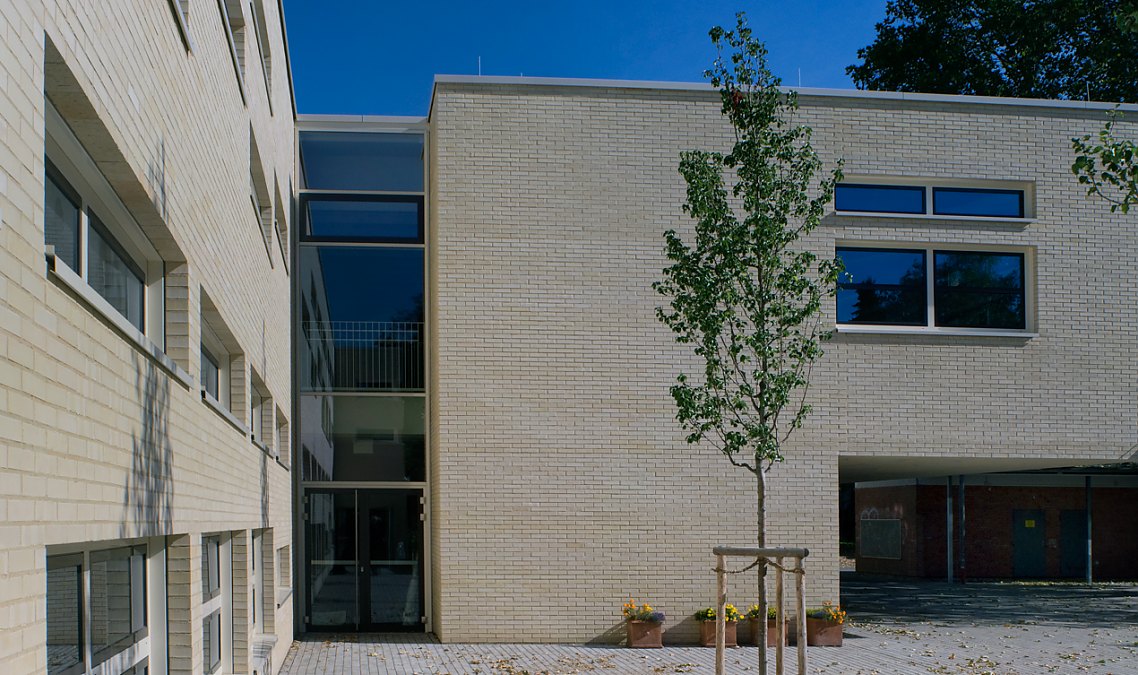 Backstein ist sowohl außen als auch innen das dominierende Material bei diesem Schulneubau. Dafür gab es neben den praktischen Vorteilen des Backsteins wie Langlebigkeit, Robustheit und Wartungsfreiheit natürlich auch gestalterische Gründe. So verbindet der weißgelbe Backstein die neue Schule mit dem bereits bestehenden Klinkerbau der Turnhalle zu einem harmonischen Ensemble.