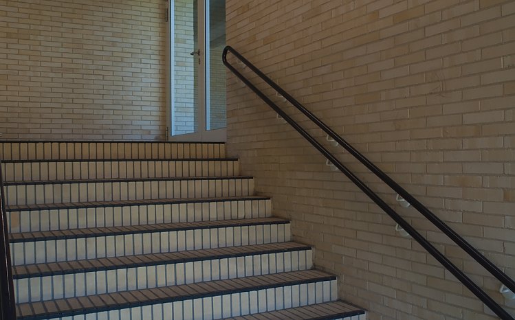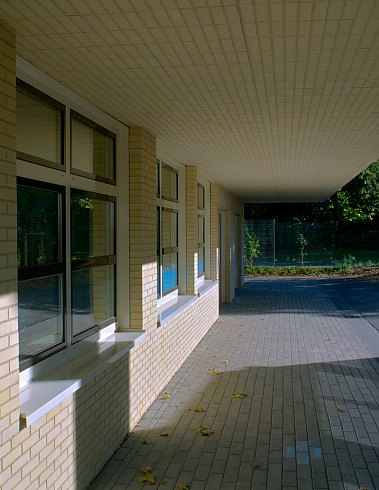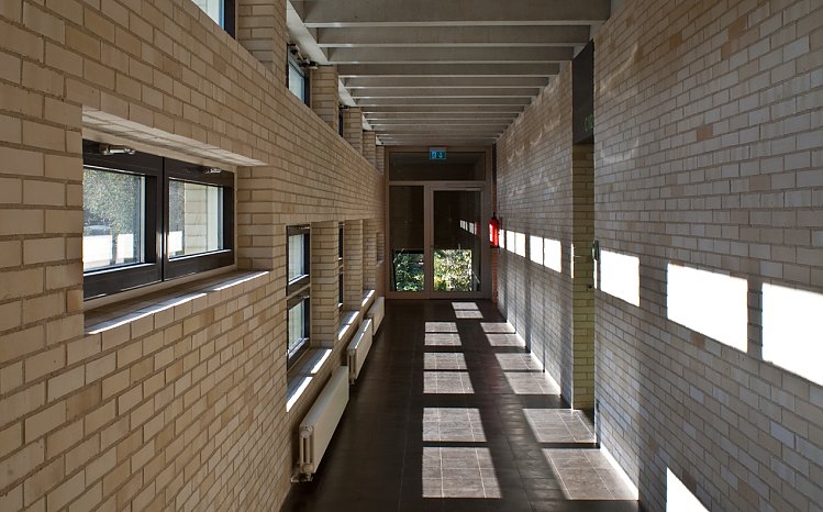 Mehr lesenDie Materialgleichheit aller Flächen unterstützt die vom Architekten angestrebte Skulpturalität des Baukörpers. Alle Wandflächen der Flure und Gemeinschaftsräume sind ebenfalls verklinkert. Besonders in den Treppenräumen trägt der Backstein zu einem Spiel aus Material, Licht und Bewegung bei. So wird der Schulneubau gleichzeitig zur „Architektur-Schule“.