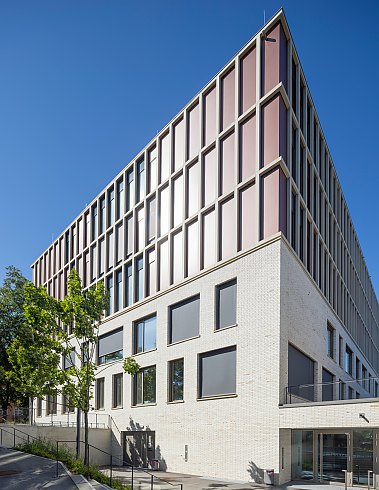 Der markante Sockelbau ist mit einer vorgehängten Klinkerfassade im Läuferverband verkleidet. Für eine ruhige, harmonische Anmutung wurde der Farbton des Fugenmörtels genau auf die Klinkerfarbe abgestimmt. Durch die erdig-sandigen Farbtöne und die raue Struktur der Klinkerfassade wirkt der Sockelbau als kraftvoller Baustein, der die eher filigranen Obergeschosse trägt.