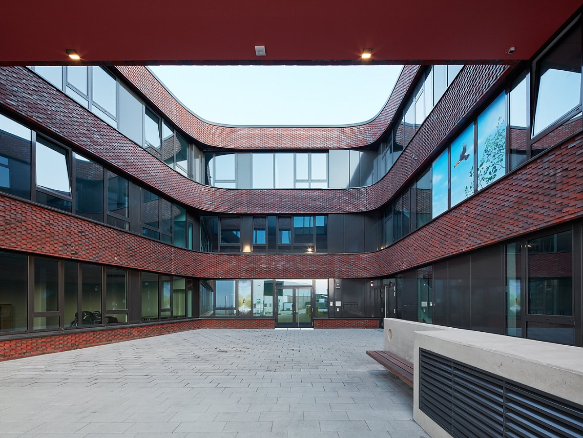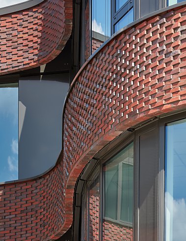 Ein Blick in die Innenhöfe offenbart die technische Raffinesse der Fassadenkonstruktion. Die Klinkerbänder lösen sich in den Ecken von ihrem Untergrund, legen sich in Kurven vor ihn und halten das Gebäude fest zusammen. Das Bauwerk schlängelt sich förmlich über das Grundstück – und wird seinem Namen „The Snake“ mehr als gerecht.