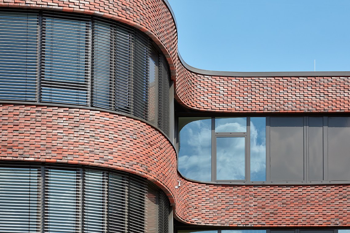 Die Ziegelsteine der umlaufenden Geschossbrüstungen sind speziell geformt, sodass jeder Stein winkelförmig absteht und sich in der Gesamtheit der Eindruck einer geschuppten Schlangenhaut ergibt. Diese Anmutung wird durch die Einzigartigkeit der Oberflächenstruktur und die Farbigkeit eines jeden Ziegels zusätzlich betont. Durch die wechselnde Laufrichtung der Ziegelsteine von Geschoss zu Geschoss ändert die Außenhaut optisch mehrfach die Richtung – sie scheint sich zu bewegen.